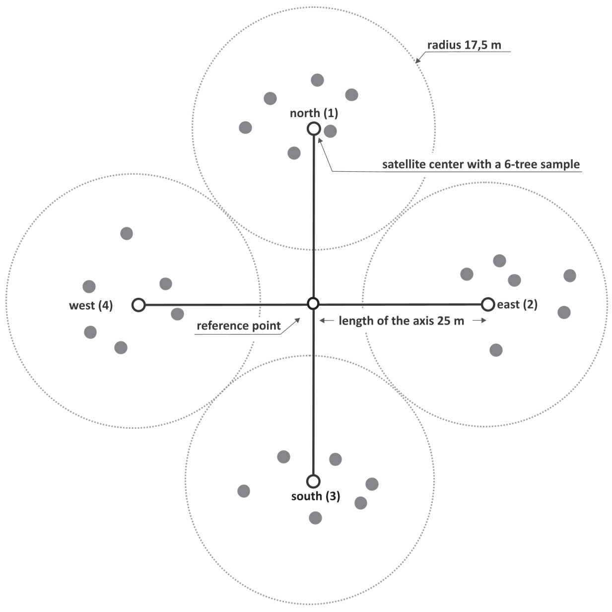 The standardized plot design used in the Forest Condition Survey in Germany is the so-called cross-cluster plot, consisting of four 6-tree plots.